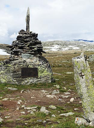 < Das Denkmal neben dem Rastplatz Mefjellet erinnert an eine Tragödie im Jahr 1812, |