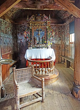 Die Altartafel stammt aus den 1690er Jahren, Der prachtvoll gedrechselte Stuhl war wahrscheinlich dem Bischof vorbehalten. > |