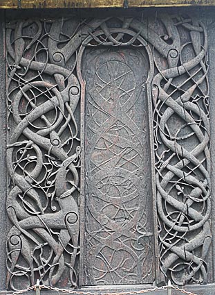 Stilisierte Tiere im Kampf, deren Körper ineinander verflochten sind. Typisch ist die Flechtwerkornamentik, das Wechselspiel zwischen breiten und schmalen Linien sowie die fließenden Umrisse in den Motiven. Diese stellen Variationen über Stilarten zur Zeit der Wikinger dar, wie es sie auf den Runensteinen in Schweden und den britischen Inseln gibt.