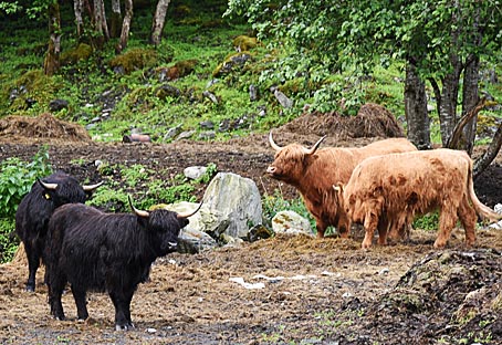 Neben einem Wasserfall treibt gerade eine ^ Gischtwolke davon. Schottische Hochlandrinder am Vassbakken |