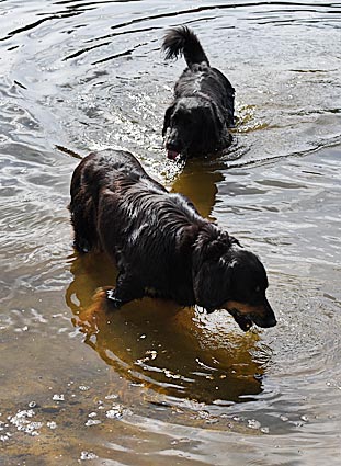 Nach der langen Fahrt freuten die Hunde sich über ein Bad im Regnitzaltwasser > |