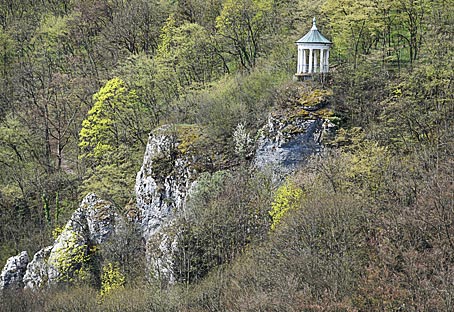 Blick entlang des Wiesenttals in Richtung Ebermannstadt/Forchheim und zum Prinz-Rupprecht-Pavillion, der hoch auf einem Felsen thront.