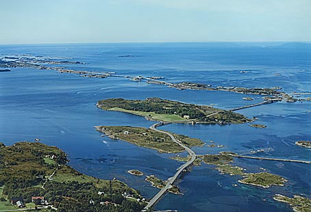 Die Atlantikstraße windet sich auf 8 km über 8 Brücken sowie viele Inseln, Holme und Schären quasi direkt durch das Meer.