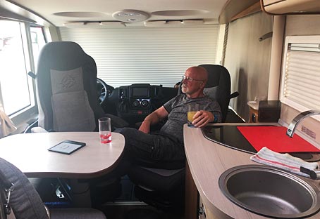 Wegen Corona durften wir in Dänemark nicht übernachten. Transit war erlaubt, aber man musste noch am gleichen Tag wieder ausreisen und das durch Vorzeigen des Fährentickets bei der Einreise nachweisen. So waren wir gezwungen, unmittelbar vor der dänischen Grenze noch einen kurzen Aufenthalt einzuschieben. Es war sehr sonnig, heiß, und der Ausblick auf dem Parkplatz in Handewitt (54.7786, 9.3343) war nicht gerade attraktiv. Deshalb haben wir einfach die 'Schotten' dicht gemacht und den Nachmittag im beschatteten Wohnmobil verbracht. Am nächsten Morgen hieß es dann: um 5 Uhr früh aufstehen. Zwischen 10 und 11 Uhr mussten wir in Hirtshals an der Fähre sein. Und das Hündchen musste vorher noch gassi geführt werden.