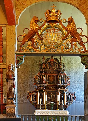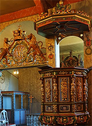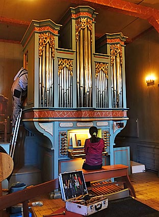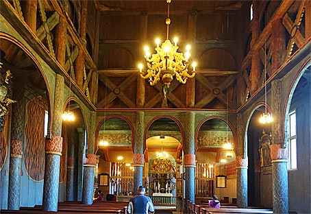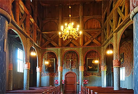 Zeitweise war die Stabkirche innen komplett weiß gestrichen. 1921 wurde sie in den ursprünglichen Farben restauriert.