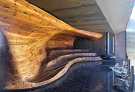 Von außen nur eine unscheinbare Kiste aus gerostetem Rohstahl, findet man innen organische Strukturen aus geölter Kiefer vor,