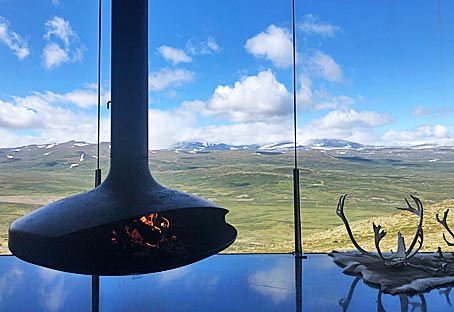 Zwischen Juni und Oktober kann man warm und windgeschützt durch die Glaswand den fantastischen Blick auf die Gipfel der Snøhetta genießen.
