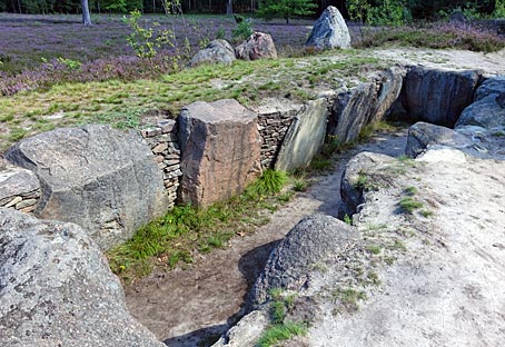Der Erddamm des Hünenbetts wurde von stehenden Findlingen und Zwickelmauerwerk eingefasst.
