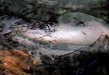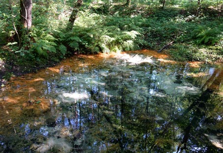 Der Quelltopf der Schwindequelle zeigt intensive Farben, die auf den Fotos durch die Spiegelung leider nicht richtig zu sehen sind. Auf dem linken Bild kann man Ablagerungen von türkisfarbigen Manganoxiden erkennen. Bei den rötlichen Bereichen handelt es sich um Eisenoxid. Zu der Oxidation des im Quellwasser gelösten Eisens kommt es, sobald das sauerstoffarme, kalte Wasser (9°C) aus dem Untergrund auf sauerstoffreicheres, wärmeres Wasser trifft. Unterstützt wird dieser Vorgang zusätzlich noch von speziellen Eisenbakterien.