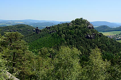 Blick zum Kleinhennersdorfer Stein (hinten links) mit seinen Felsvorsprüngen |