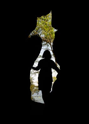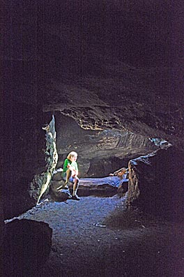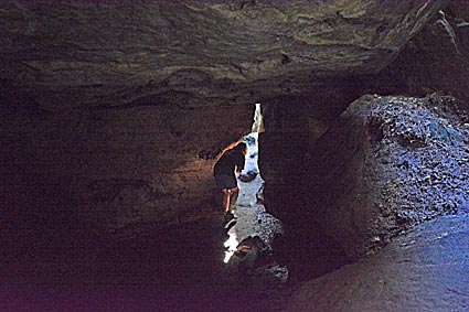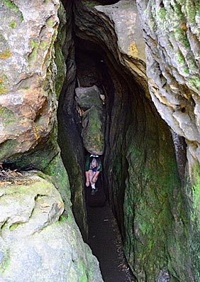 Die enge Klufthöhle geht tief in den Fels hinein und der Zugang ist durch einen Klemmstein etwas schwierig.