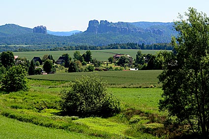 Links sind die 3 Tafelberge nebeneinander zu sehen: Papststein, Gohrisch und Pfaffenstein.
