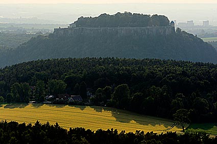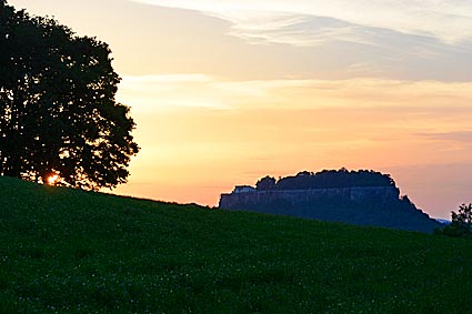 Der interessant geformte Gipfel der großen Hunskirche und die Festung Königstein im Abendlicht