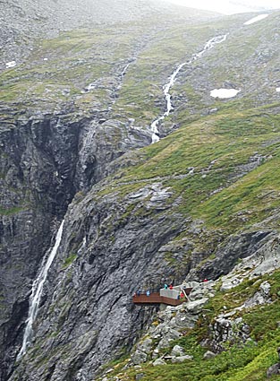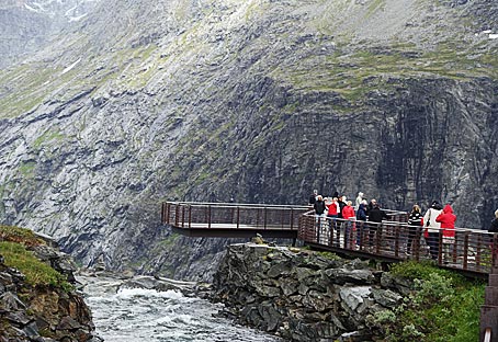 Beim Gudbandsjuvet (62.330761N, 7.471739E) ist sogar der Aussichtsgang eine Attraktion. Das Wasser formte hier ein System aus tiefen Gletschermühlen und bizarren Formationen. |