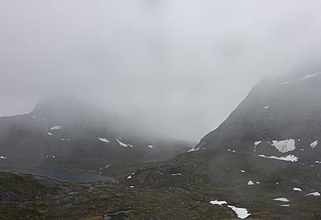 Auf der Passhöhe über dem Trollstiegen überraschte uns dann schlechtes Wetter mit Schneeregen. ^