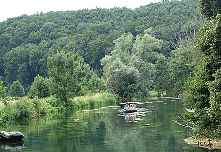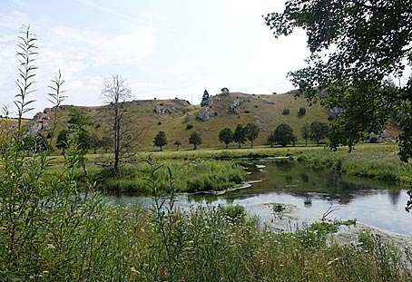 Ökologisch wertvolle Gegensätze auf engem Raum: natürliche Flusslandschaft der Brenz und trockene Hänge mit Wacholderheiden.