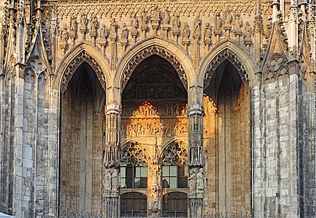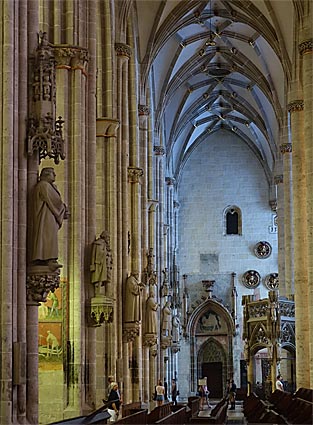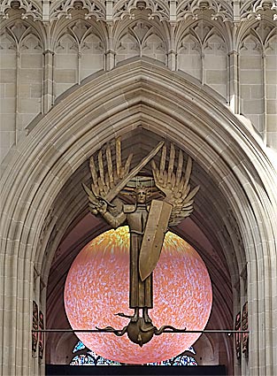 rechts: die Figur des Erzengels Michael im Hauptportal an der Schwelle zwischen Turmhalle und Mittelschiff