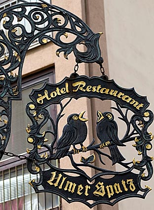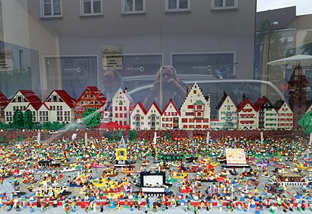 Ulm-Miniatur im Schaufenster eines Spielwarengeschäfts — Der legendäre Ulmer Spatz begegnet einem hier überall.