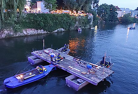 Als es zu dämmern begann, nahmen die Ulmer Schachteln, die die Lichter aussetzen, und das Boot mit dem Feuerwerk ihre Stellung ein.