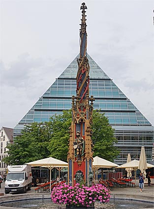 Die Glaspyramide der Stadtbibliothek bildet einen starken Kontrast |