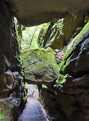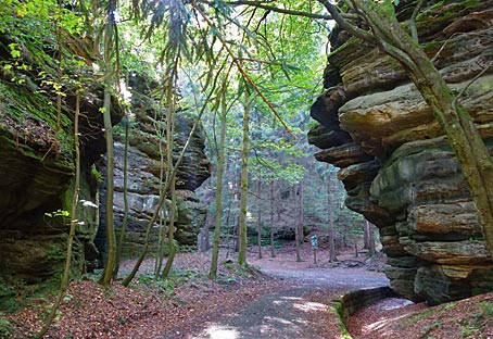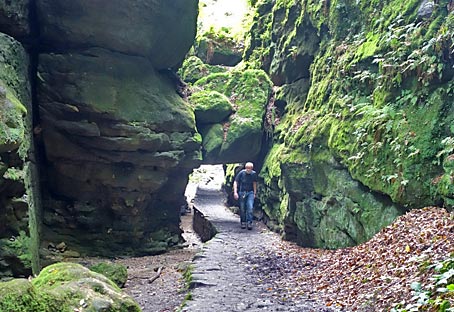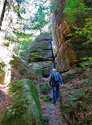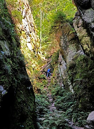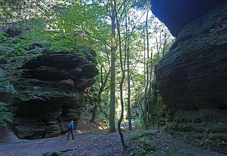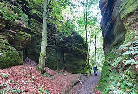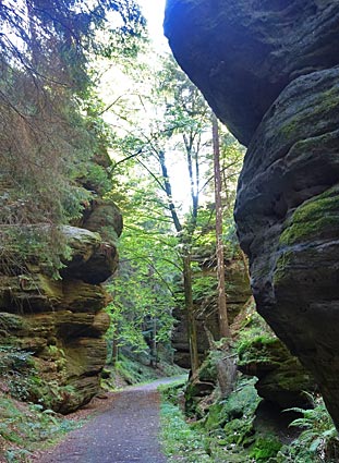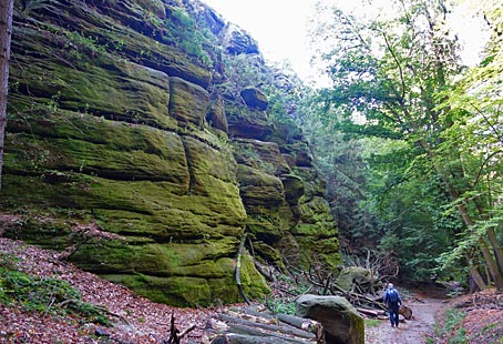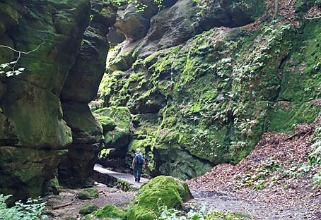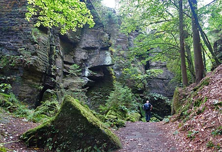 Im Kohlgrund säumen hohe Felsen den Weg durch die feuchte Schlucht. |