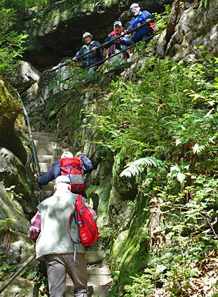 In der Teufelskammer am Ende der engen Schlucht geht es über Eisenstiegen hinauf auf die Hochfläche.