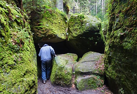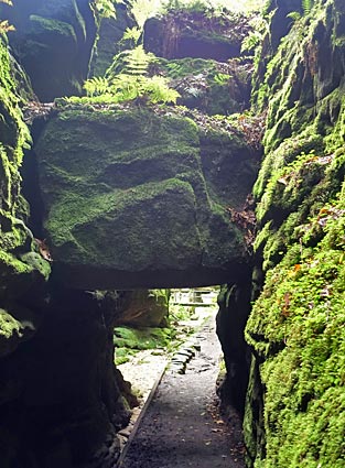 Das bekannte Uttewalder Felsentor besteht aus 3 mächtigen Felsblöcken, die sich zwischen den Felswänden verkeilt haben.