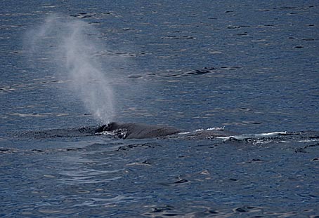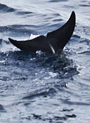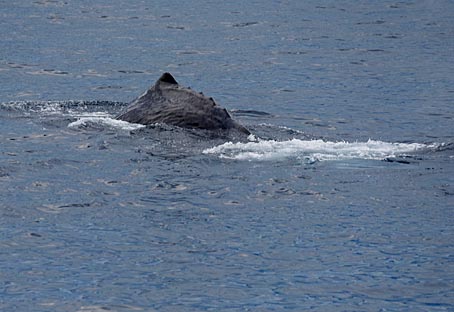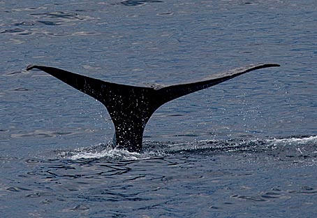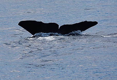 Der Pottwal bleibt nun ewa 10-20 Minuten ruhig an der Oberfläche liegen um sich auszuruhen. Dann nimmt er Schwung und taucht wieder ab. Auf dem Foto oben rechts sieht man die niedrige Finne, die auf einem Buckel weit hinten auf dem Rücken liegt mit anschließenden Höckern bis zum Schwanz. Nachdem der Pottwal einen deutlichen Buckel gemacht hat, gleitet er fast senkrecht hinab und hebt dabei die Fluke weit aus dem Wasser. |