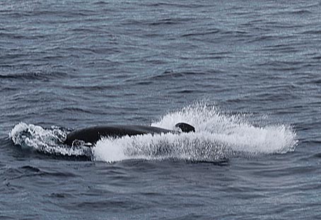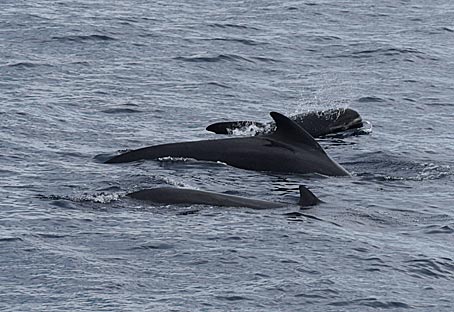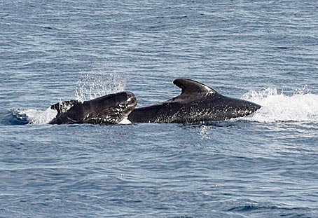 Auf dem rechten Bild sieht man einen Grindwal beim "Spyhoppen", > |