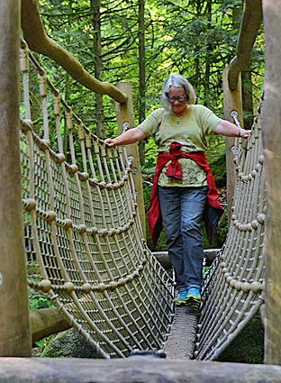 < Wer sich nicht über diese Brücke traut, kann sie über einen Trampelpfad umgehen. |