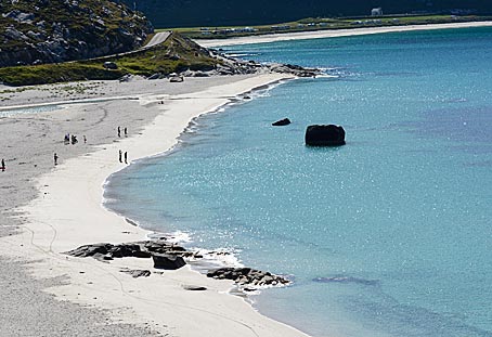 Der lange Strand von Haukland mit seinem feinen weißen Sand und dem klaren, kristallblauen Wasser