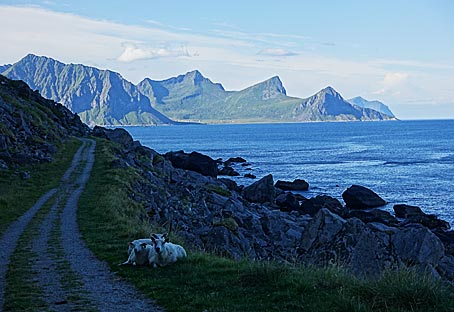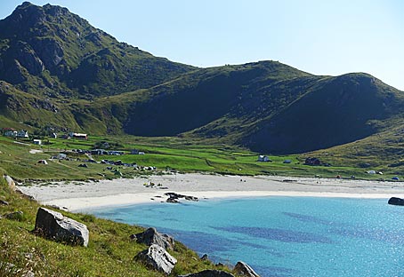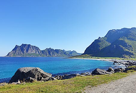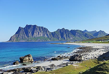 Der Blick über den weißen Sandstrand Uttakleivs und über das offene Meer auf die schroffen Gipfel ist einmalig.