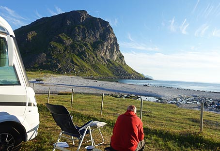 Wir haben direkt über dem Strand von Uttakleiv gestanden (68.2148, 13.5096) mit Blick auf den Veggen (489 m)