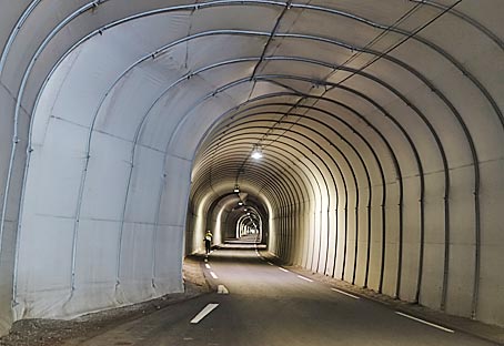 Der Uttakleivtunnel führt unter dem Mannen hindurch. Der 1 km lange, spärlich beleuchtete Tunnel ist nur einspurig für beide Richtungen!