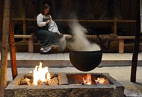 Im Bankettsaal wird auf Wikingerart im Eisenkessel über offenem Feuer gekocht.