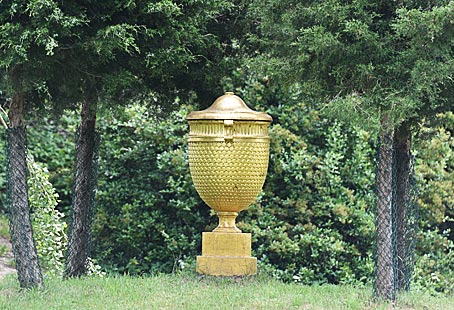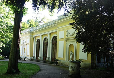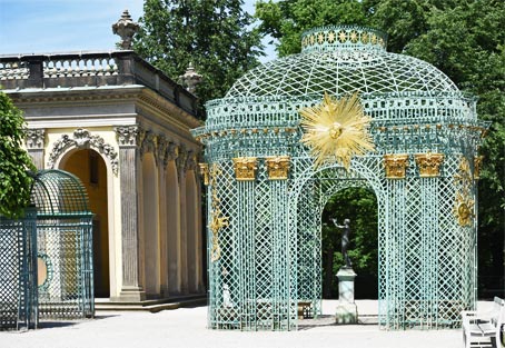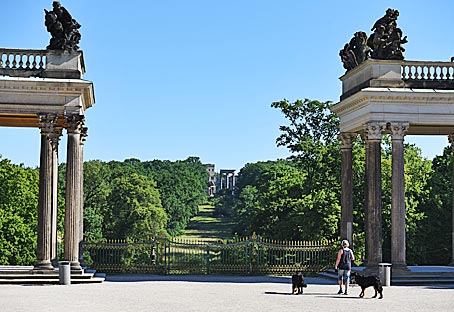 Nordseite: Blick vom Ehrenhof mit den Kolonnaden zum Ruinenberg — Gitterpavilion mit Sonnenmotiv als Symbol der Aufklärung und der Menschlichkeit