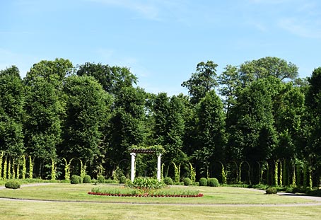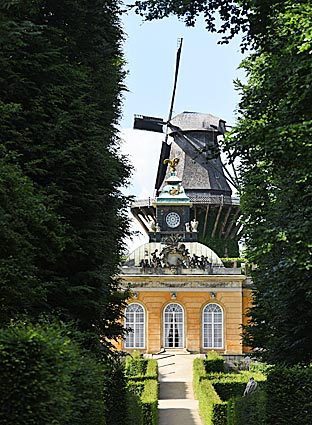 Blick durchs Heckentheater zu den Neuen Kammern und der Historischen Windmühle