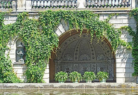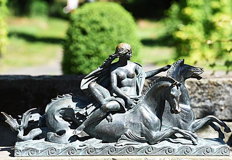 Diese kleine Bronze in der Brunnenlaube mag ich ganz besonders: Eine Nymphe reitet auf Hippokampen (vorne Pferd, hinten Fisch) — Hippodrom
