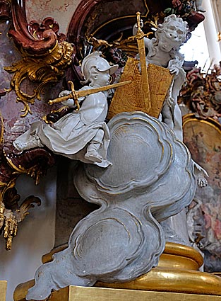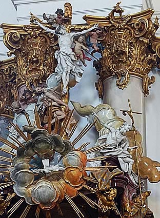 Die vollplastischen vergoldeten Figurengruppen über dem Gebälk der Vierungspfeiler