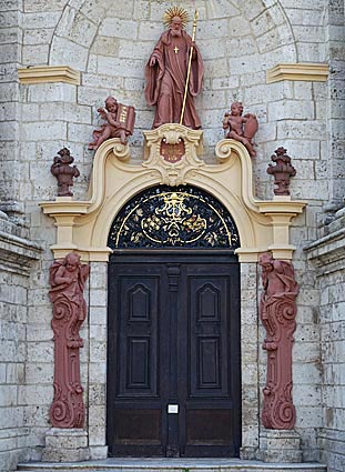 Die Portalrahmung ist von der Figur des hl. Ordensgründers Benedikt bekrönt,