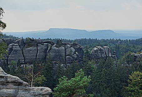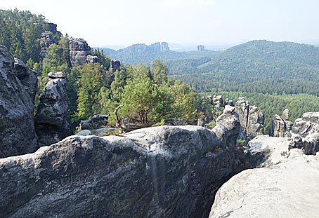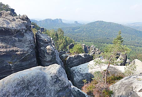Hier sollte man etwas verweilen und die Fernsicht auf die Schrammsteinkette und den Falkenstein genießen.