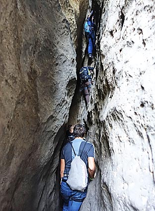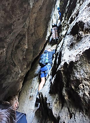 Nach einem fast senkrechten Aufstieg muss man von der rechten Seite der Kluft auf die linke Seite übergewechseln.