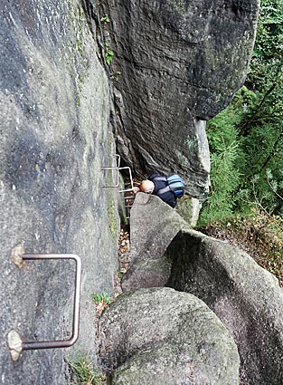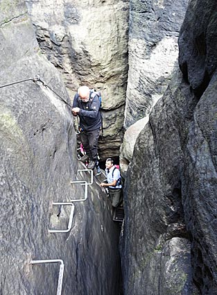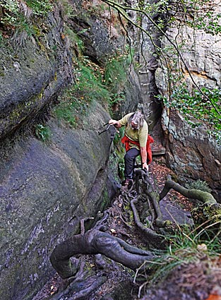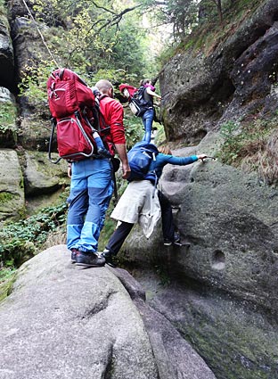 links: Zum Schluss geht es noch mal 3 m hinauf bis zum Durchgang an der Jammerspitze, einem markanten Kletterfelsen.