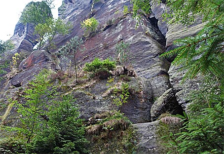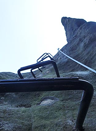 links: Die senkrechte Einstiegswand der Zwillingsstiege ist ca. 5 m hoch und endet an einem kleinen Podest.