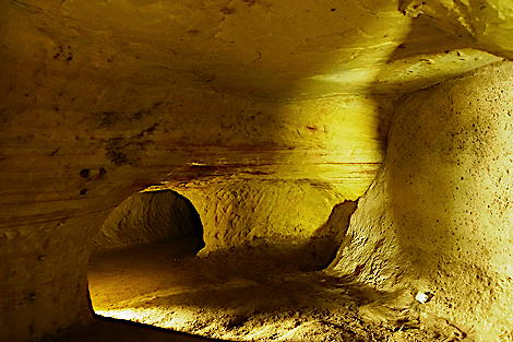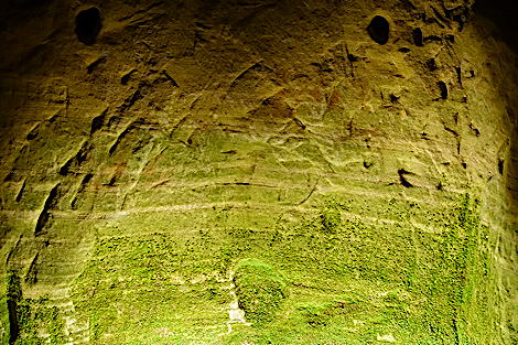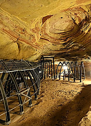 Buntsandsteinhöhlen in Europa. Sie entstanden durch Buntsandsteinabbau im 17. Jhdt und umfassen viele Stockwerke, die nach oben hin immer niedriger werden. ![]() Fußabdruck eines Dinosauriers |